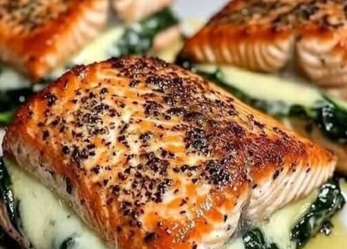 Blackened Salmon Stuffed with Spinach & Parmesan is a delicious and elegant seafood dish perfect for a weeknight dinner or a special occasion. It combines the bold flavors of blackened seasoning with the creamy, savory richness of melted cheese and wilted spinach. This dish offers a perfect balance of protein, greens, and flavor—all in one mouthwatering fillet.