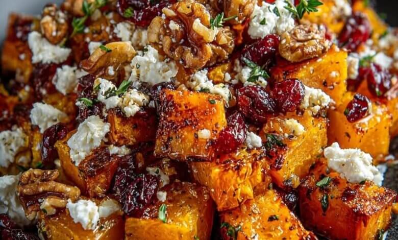 Caramelized Butternut Squash with Feta, Walnuts & Cranberry-Honey Drizzle