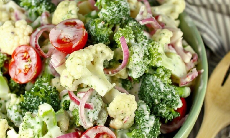 Rinse the broccoli and cauliflower, then cut them into bite-sized florets. Place them in a large salad bowl. - Add the Remaining Ingredients
