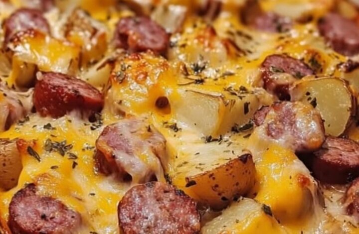 Golden Cheesy Potato & Smoked Sausage Bake