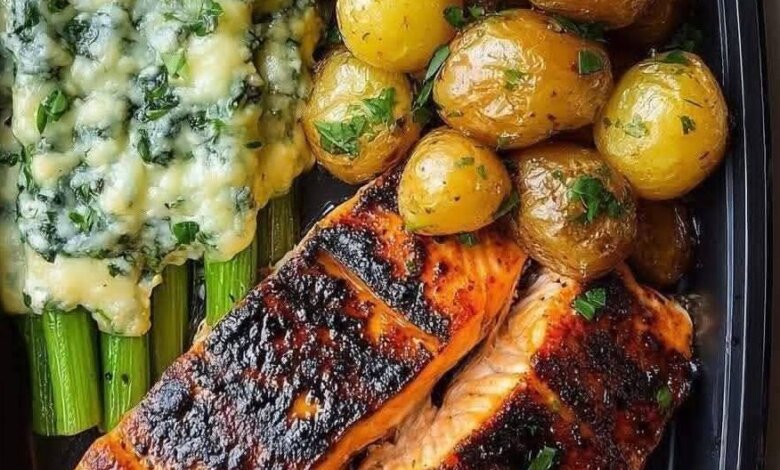 Gourmet Grilled Salmon with Baby Potatoes & Cheesy Asparagus