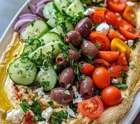 Layer the hummus with cucumbers, tomatoes, olives, red onion, and feta. Sprinkle with fresh herbs, then season lightly with salt and pepper.