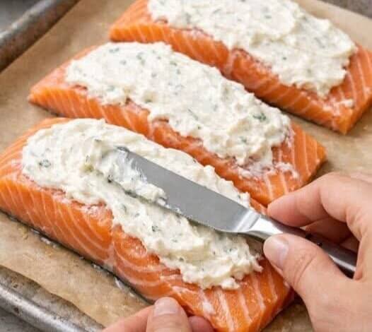 Spread the creamy Parmesan mixture evenly over the top of each salmon fillet, covering the surface completely.