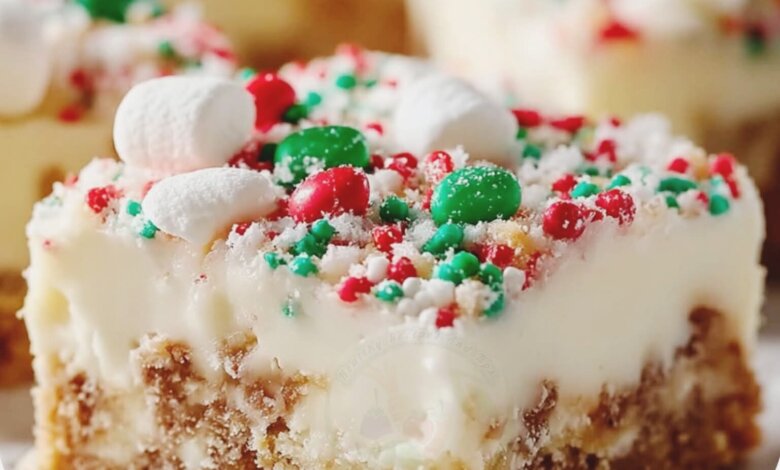5. Immediately sprinkle 1 cup of mini marshmallows, 1/4 cup of festive sprinkles, and 1/2 cup of chopped pecans (if using) evenly over the melted white chocolate layer.