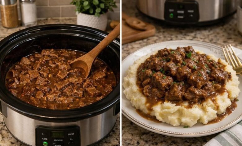 This slow cooker beef recipe tastes like something you’d order at a cozy diner, but it practically cooks itself. Tender chunks of beef simmer all day in a rich, buttery, savory gravy made with onion soup mix, ranch seasoning, and brown gravy mix. The result is ultra-soft, flavorful beef that falls apart effortlessly and pairs perfectly with creamy mashed potatoes.