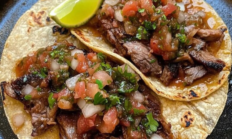 Smoky Carne Asada Tacos with Fresh Salsa & Zesty Onion Relish