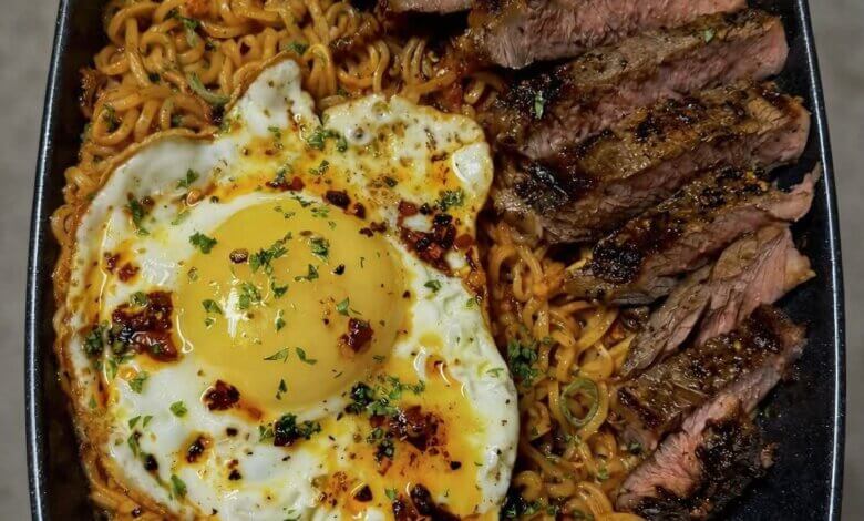 Tender, juicy steak tossed with chewy noodles, spicy sauce, and a perfectly cooked egg on top — a quick comfort meal that hits all the flavor notes.
