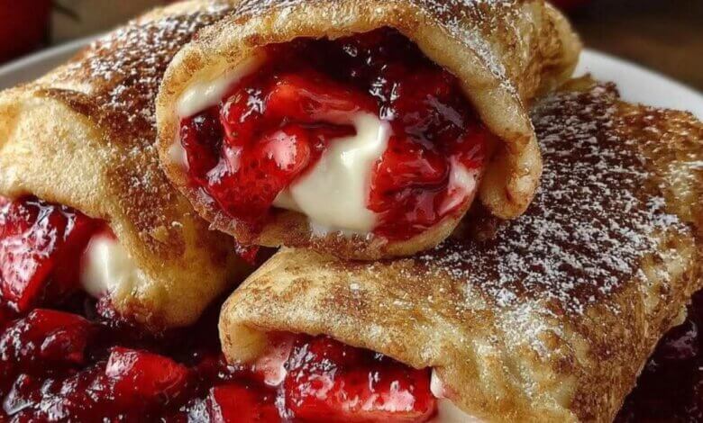 Crispy on the outside, creamy cheesecake filling inside, with sweet strawberries and cinnamon sugar.