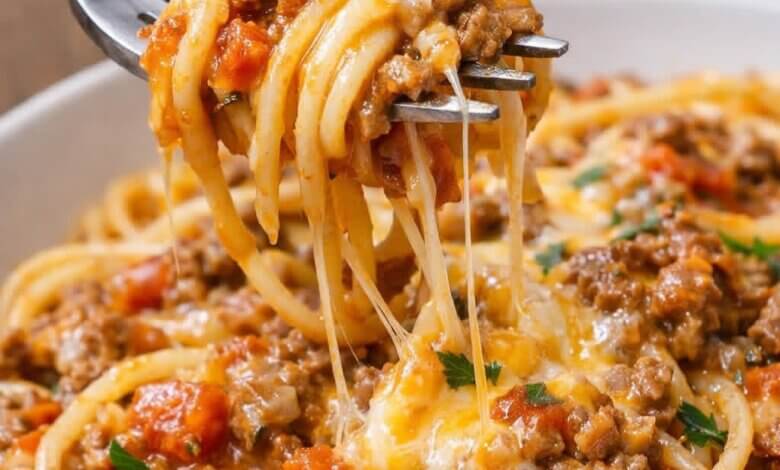 Add the cooked spaghetti to the skillet and toss to coat the noodles evenly in the sauce.